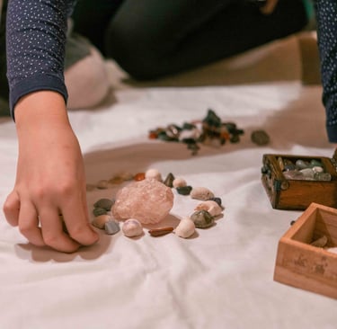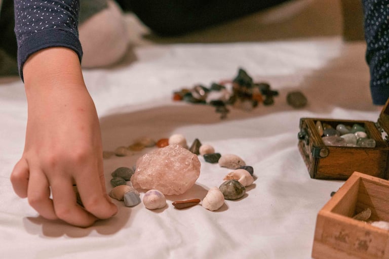 Aus vielen kleinen Heilsteinen entstehen Spiralen, Mandalas und Bilder – oder eine große Koppel für alle Einhörner. Und mit ihnen ein Raum der inneren Ruhe, Achtsamkeit und Selbstzentriertheit im Kind.